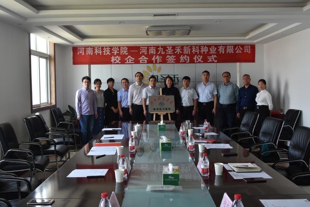 9月26日,91论坛 与河南九圣禾新科种业有限公司战略合作及教学实践基地签约仪式在河南九圣禾新科种业有限公司举行。河南九圣禾新科种业有限公司董事长王文玉、总经理孙志军、副总经理赵文奇、我校教务处副处长赵新亮、生命科技学院院长刘明久、小麦中心主任胡铁柱、副院长胡海燕及办公室人员出席签约仪式。