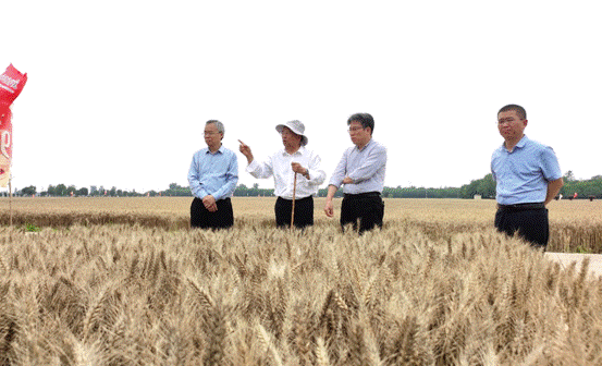 按照学习贯彻习近平新时代中国特色社会主义思想主题教育“学思想、强党性、重实践、建新功”的总要求,切实用主题教育成效推进工作, 5月31日下午,校党委书记宋亚伟、校长阚云超、副校长胡铁柱等一行,调研我校国家现代农业科技示范展示基地(新乡县小麦千亩示范基地),慰问、看望全国人大代表茹振钢教授,深入了解科研育种材料和新品种繁育示范田麦收进展情况。