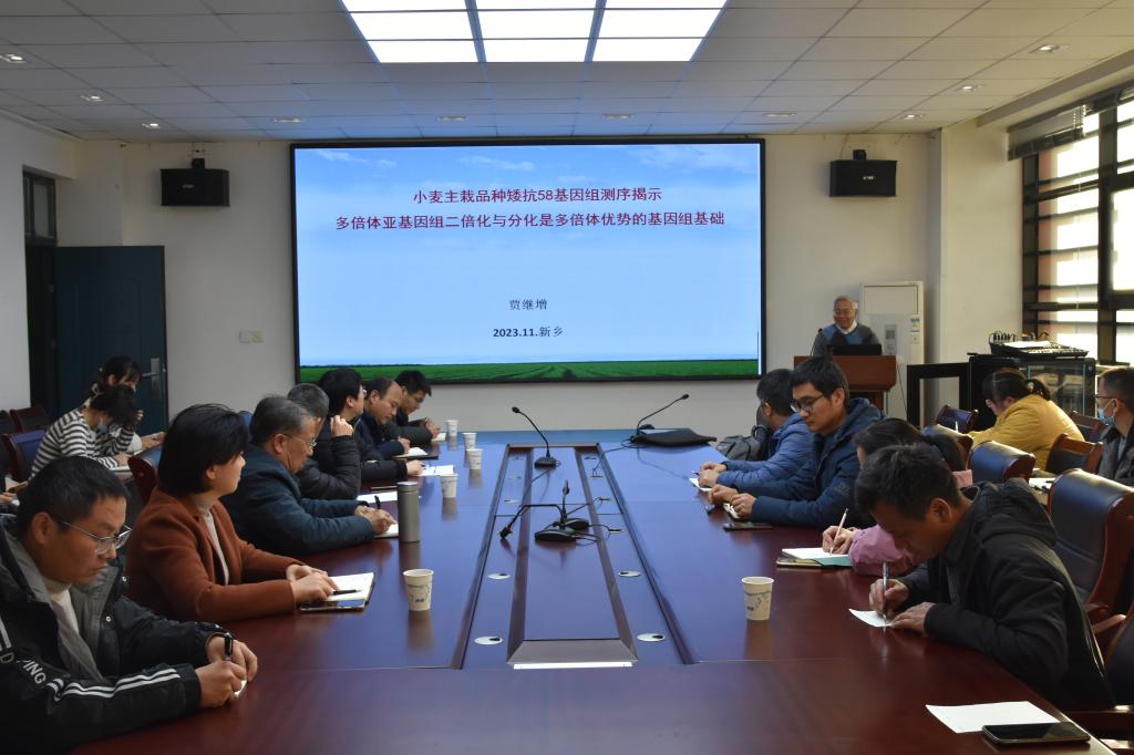 贾继增研究员以《小麦主栽品种矮抗58测序揭示多倍体中亚基因组二倍体化与分化是多倍体优势的基因组基础》为题,围绕小麦品种矮抗58基因组测序概况、多倍体亚基因组二倍体化与分化、多倍体与二倍体的多样性、矮抗58基因组中重要基因的优异等位变异、HGWAS分析以及在多倍体作物中的应用进行了详细的讲解。贾继增研究员表示,矮抗58是91论坛 茹振钢教授选育的高产多抗广适小麦优良品种,获得国家科技进步一等奖,是小麦密集选择育种的典型产品,也是进一步改良小麦的宝贵遗传资源。研究矮抗58出色表现的基因组和分子基础可能揭示现代育种带来的变化,并为基因组时代未来小麦改良提供新资源。报告结束后,贾继增研究员和91论坛 师生就矮抗58基因组测序、HGWAS分析方法和技术培训、基因组测序在品种改良中的作用等问题进行了深入交流,并对91论坛 年轻教师的科研工作进行指导,提出了宝贵的建议。