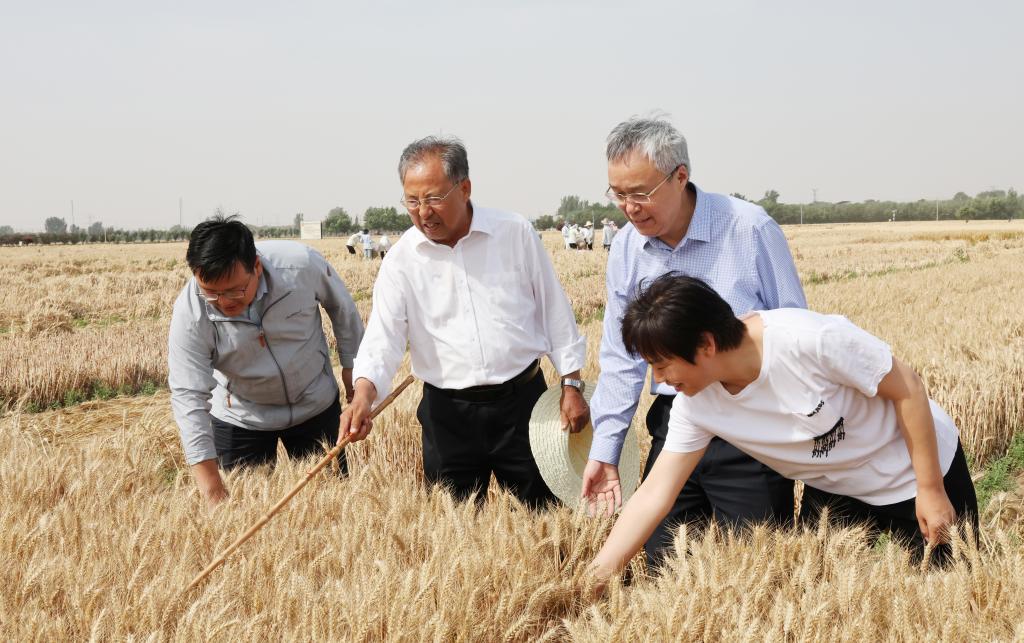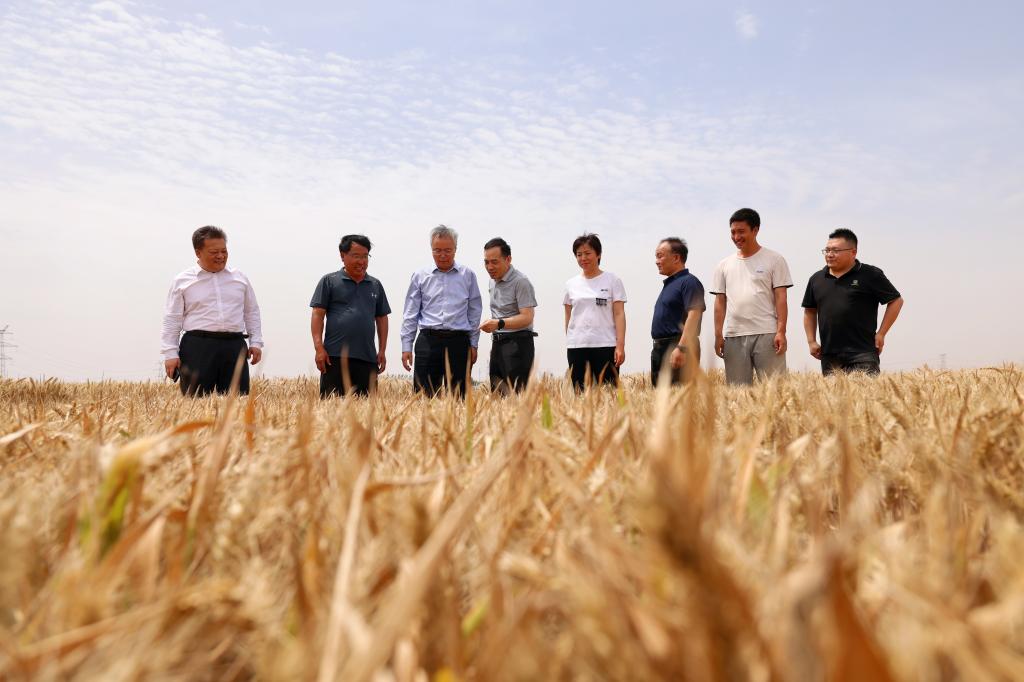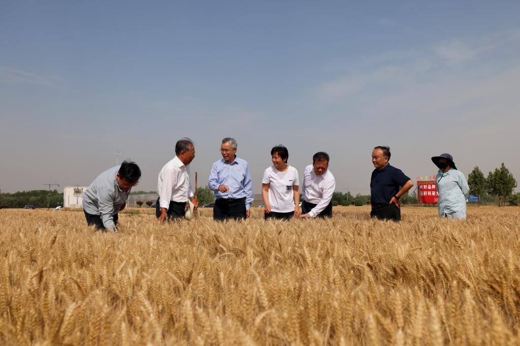 在小麦遗传改良研究中心辉县中小营育种基地,宋亚伟一行与坚守麦收一线的师生亲切座谈,并先后查看了百农277、百农607、百农627等小麦新品种的成熟情况,欧行奇教授详细介绍了小麦最新育种进展、优质专用品种百农627的特征特性以及小麦未来的发展方向。