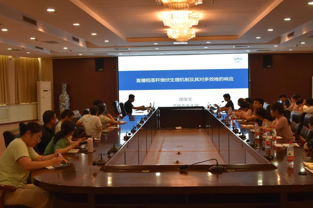 邵玺文教授作了题为《直播稻茎秆倒伏生理机制及其对多效唑的响应》的报告。水稻是我国第一大口粮作物,邵玺文教授以水稻生产中直播栽培技术优势突出但倒伏发生频率高的问题,利用生产上常用的控制作物倒伏的多效唑生长调节剂对直播稻抗倒伏性的调控效应展开研究。以基部节间抗倒性状作为研究直播稻抗倒伏性的切入点,增强基部节间折断弯矩作为改善直播稻茎秆抗倒伏能力的重要途径。发现通过多效唑浸种处理,调控节间内源激素含量,优化基部节间形态解剖结构,同时通过调控节间碳水化合物合成代谢促进了细胞壁的发育,从而增强茎秆折断弯矩,改善茎秆抗倒伏性。
