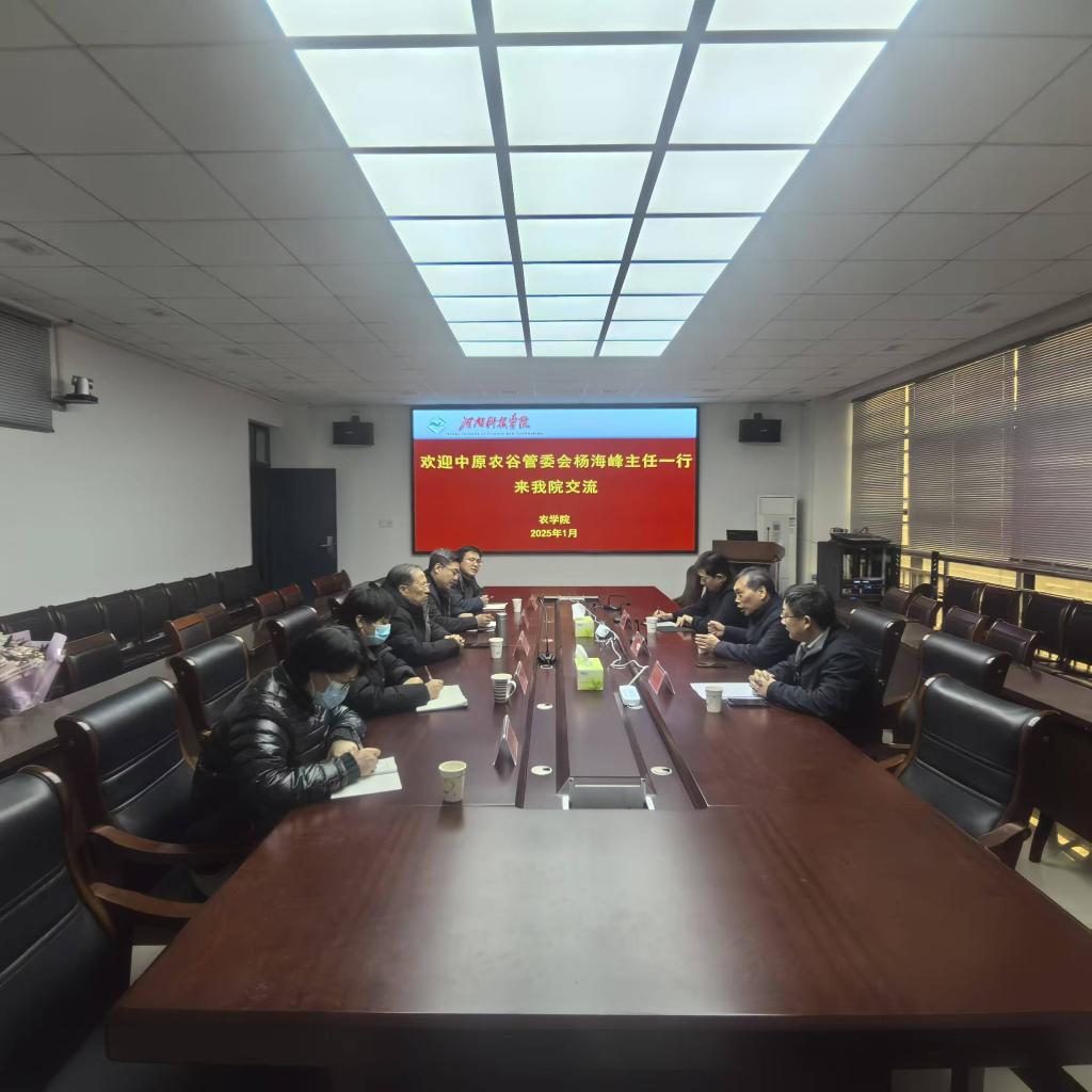 1月22日,中原农谷管委会副主任杨海峰、投资运营有限公司(下称中原农投)总经理张尽杰和中原农谷联合种业有限公司总经理范永胜一行3人来91论坛 考察交流。小麦育种专家茹振钢教授、实验室与设备管理处处长李勇超、91论坛 执行院长胡海燕、小麦研究中心主任陈向东、副主任董娜参加了交流座谈会。