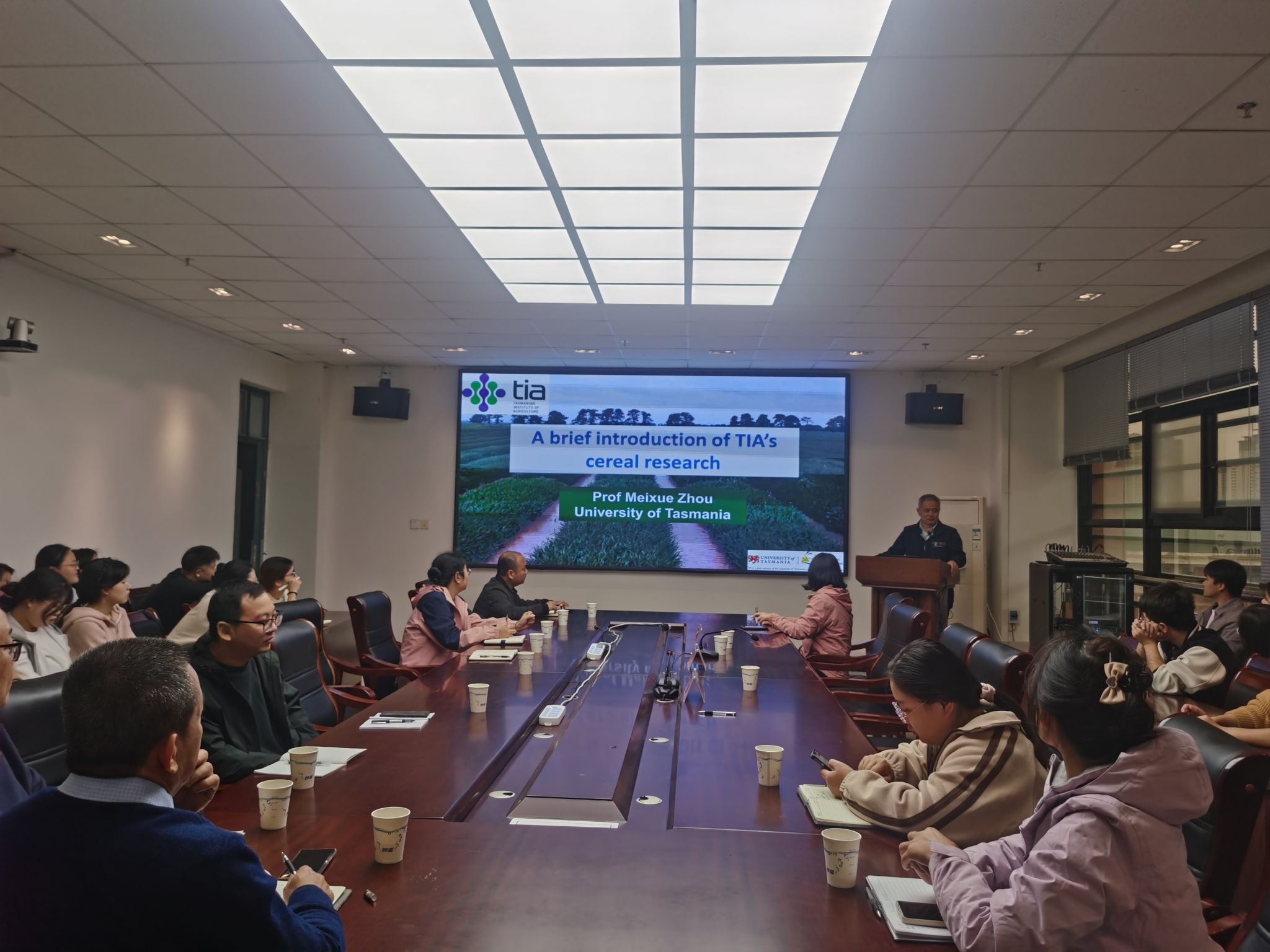 周美学教授做了题为《A brief introduction of TIA'S cereal research》的学术报告,重点介绍了该团队对热胁迫下小麦活性、持绿表型和小穗育性等方面的研究,及其在育种上的应用。报告结束后周美学教授与参会师生进行了互动探讨和深入交流,为学院教师进行胁迫研究及育种工作提供了新的思路,同时也对学院国际交流与合作起到了积极的推动作用。