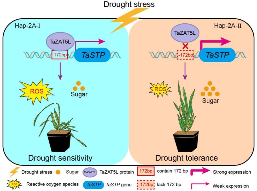 该研究鉴定了一个小麦MLP成员TaSTP,过表达TaSTP增强小麦抗旱性(图1),在干旱条件下具有更高的产量,而沉默TaSTP则呈现相反表型。转录组分析表明,TaSTP显著上调了渗透调节和糖代谢途径相关基因,从而提高了小麦抗氧化能力和糖含量。由于TaSTP-2A启动子上的172bp的插入片段形成Hap-2A-I和Hap-2A-II单倍型,两者在转录水平和抗旱性以及与锌指转录因子TaZAT5L结合存在显著差异。在Hap-2A-I材料中TaZAT5L强烈抑制TaSTP表达,但在Hap-2A-II材料中TaZAT5L则较弱抑制TaSTP表达。Hap-2A-II作为优良等位基因型在中国小麦育种过程中被正向选择。我校育成的AK58、百农4199、百农219等品种均属于该优异抗旱类型,为进一步解析我校百农系列小麦品种优异性状和育种改良提供理论基础。