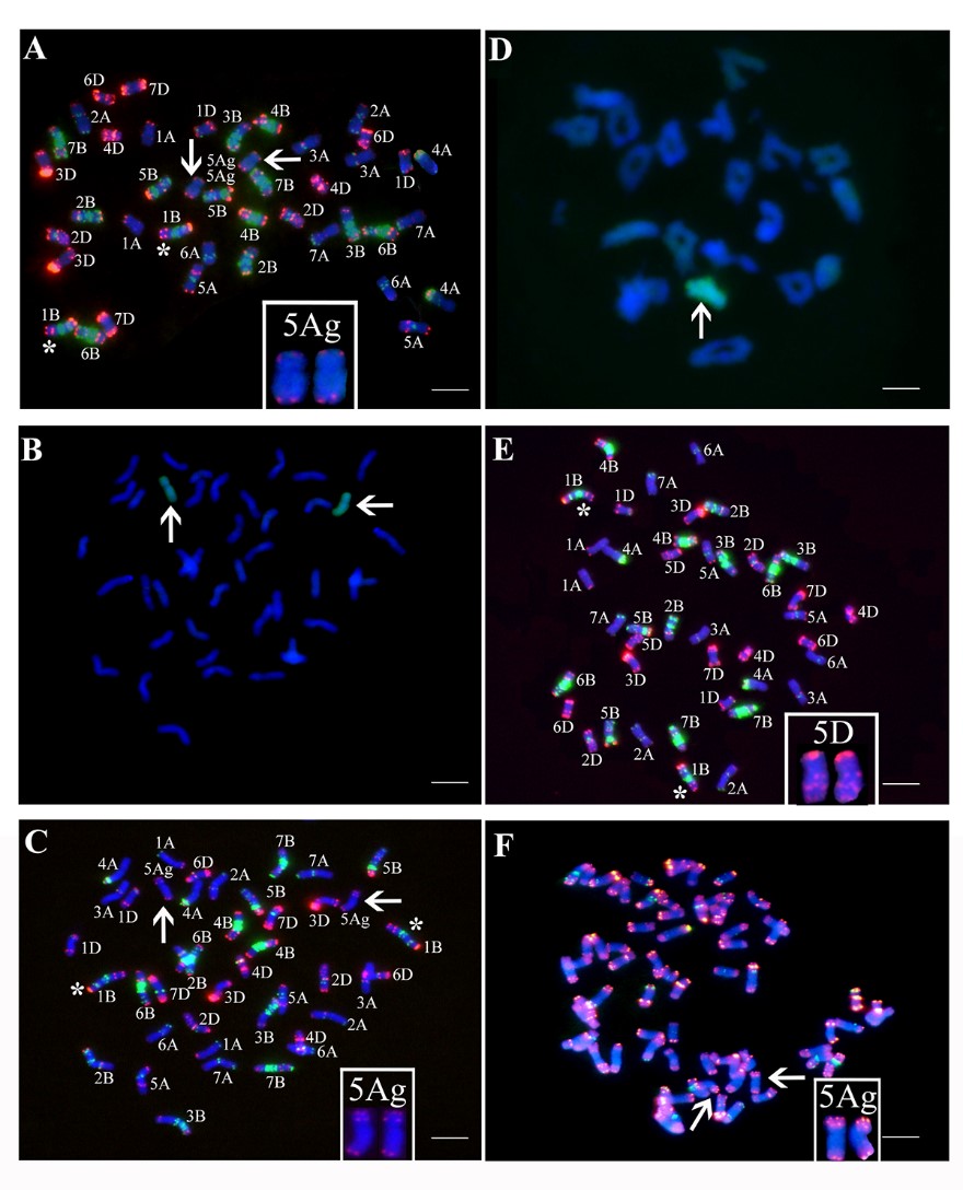 白粉病(由Blumeria graminis f. sp. tritici (Bgt)引起)和叶锈病(由Puccinia triticina(Pt)引起)是两种广泛流行的病害,严重影响了小麦的产量和品质。十倍体长穗偃麦草(2n =10x = 70)含有高抗这些病害的基因。本研究以百农矮抗58为背景,培育出了一个小麦-长穗偃麦草二体代换系DS5Ag(5D)。通过基因组原位杂交(GISH),单链寡核苷酸探针套-荧光原位杂交(ONPM-FISH)和分子标记技术对该代换系进行了分析,发现普通小麦中的一对5D染色体被长穗偃麦草的一对5Ag染色体所取代。共鉴定出28个外源染色体特异性标记,其中有22个为共显性标记。同时,利用小麦660K SNP芯片对该代换系及亲本分析,进一步确定了其外源染色体身份。该代换系整个生育期均免疫白粉病,成株期高抗叶锈病。通过对代换系和5个易感白粉病普通小麦杂交,构建了5个F5分离群体。对这5个F5群体进行抗病性鉴定,结果表明该代换系的抗病基因位于5Ag染色体,且在不同小麦背景下对两种病害表现出稳定的抗性。结合多小种抗谱鉴定和诊断标记(与已报道的长穗偃麦草抗性基因连锁)分析,表明5Ag染色体上含有的抗病基因为新基因,分别命名为Pm5Ag和Lr5Ag。