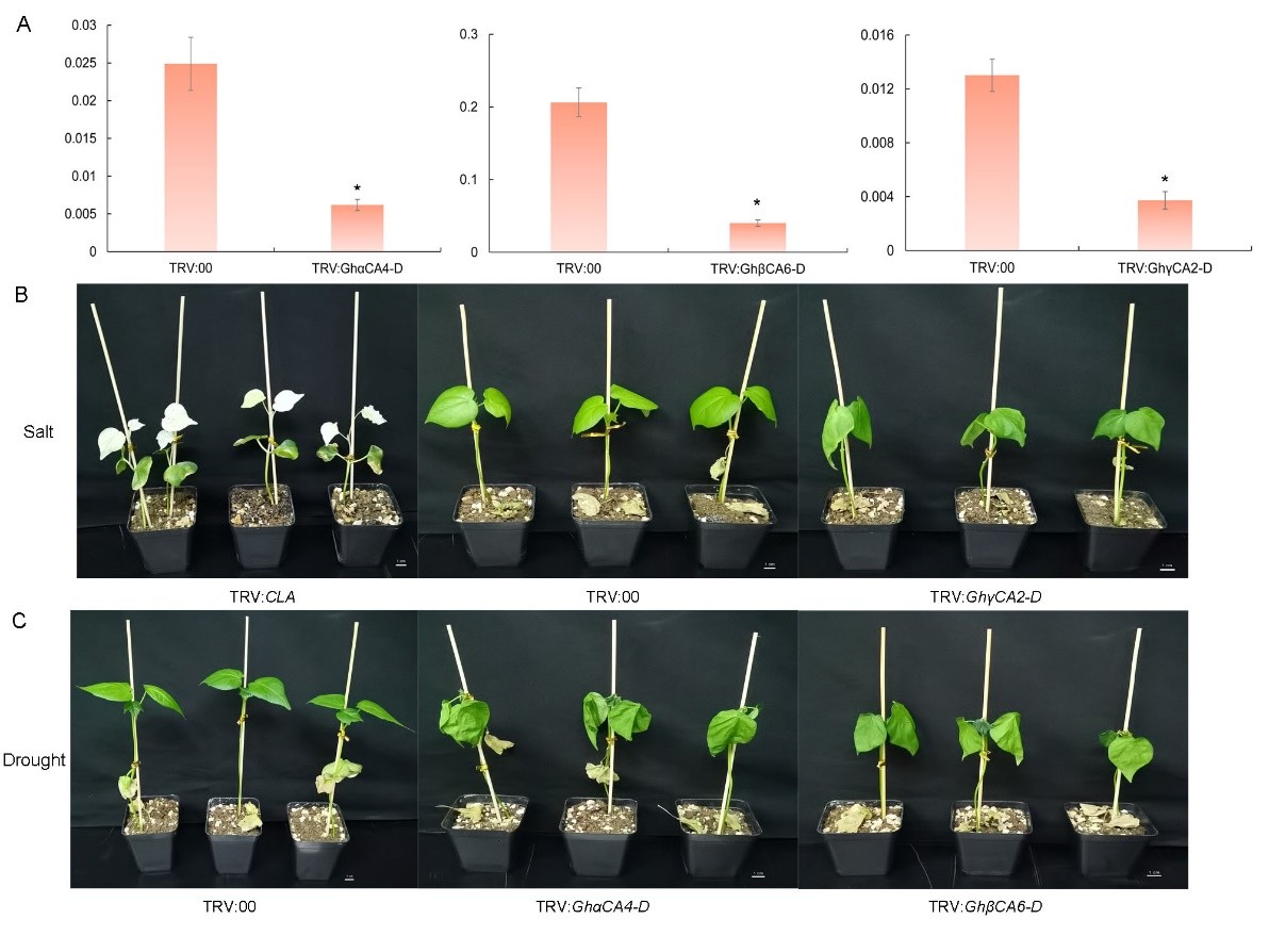 碳酸酐酶(Carbonic anhydrase, CA)是催化CO2可逆水合反应的含锌金属酶,在植物光合作用中起着重要作用,并受干旱等逆境的诱导。该研究通过陆地棉干旱胁迫转录组测序分析,并利用荧光定量PCR技术验证,确定了调控干旱的候选基因GhαCA4-D和GhβCA6-D。随后利用病毒诱导的基因沉默技术(Virusinduced gene silencing,VIGS)分别沉默GhαCA4-D和GhβCA6-D,发现基因沉默植株萎蔫严重,抗旱性降低,说明两个基因均可能正调控陆地棉抗旱过程。深入研究发现GhαCA4-D基因沉默植株更容易受到氧化损伤,GhβCA6-D基因沉默植株的气孔密度、宽度和面积均大于对照植株。GhαCA4-D和GhβCA6-D基因在棉花抗旱性的作用机制还需进一步解析。该研究为棉花抗旱性改良提供理论基础和基因资源。